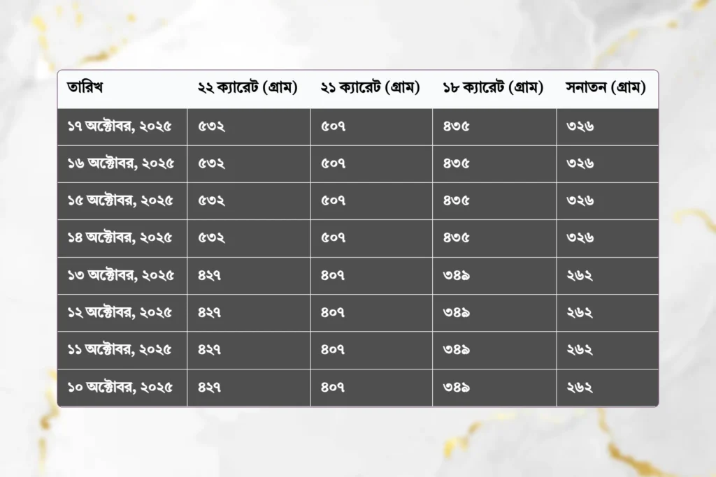তারিখ | ২২ ক্যারেট (ভরি) | ২১ ক্যারেট (ভরি) | ১৮ ক্যারেট (ভরি) | সনাতন (ভরি) |