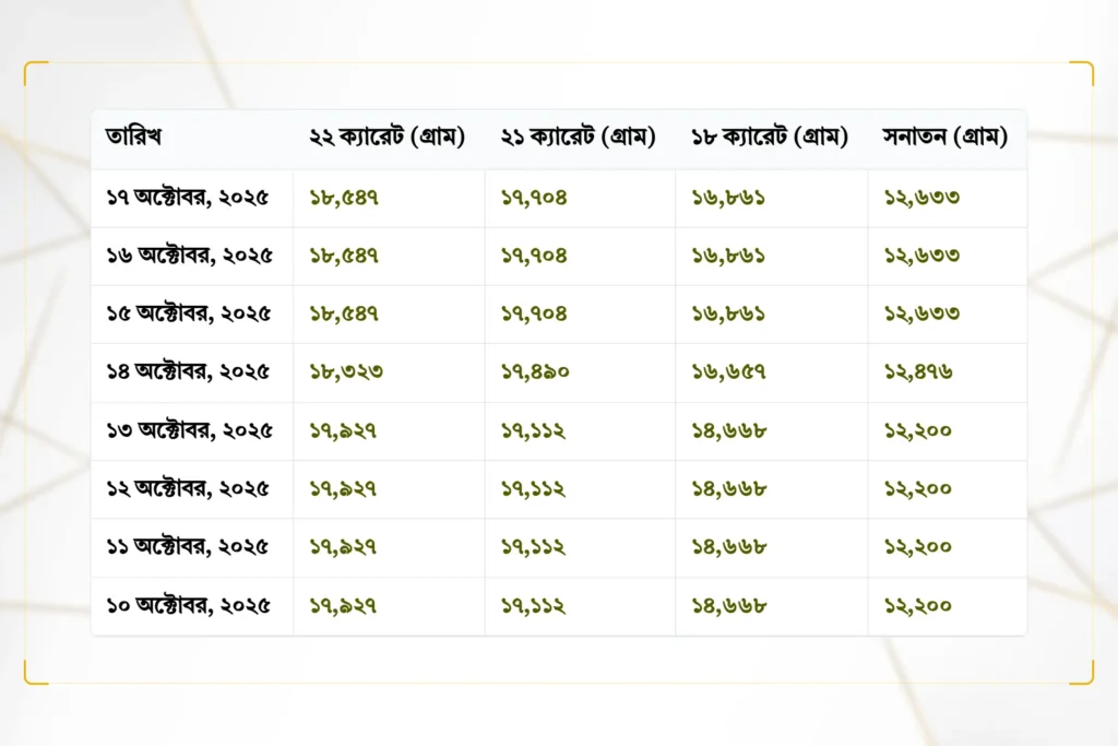 ১৭ অক্টোবর এসে তা দাঁড়ায় ২,১৬,৩৩২ টাকা ভরি, যা সপ্তাহের শুরু থেকে প্রায় ৭,২৩১ টাকা বৃদ্ধি।